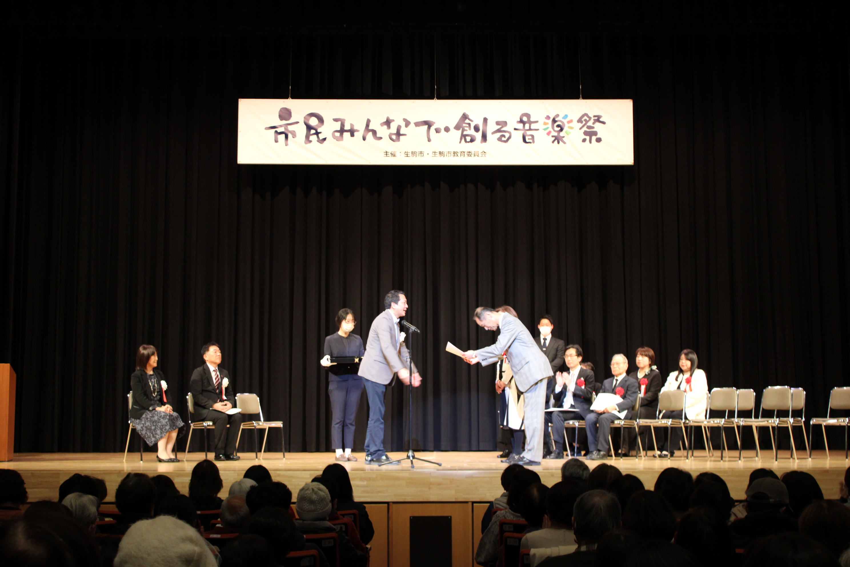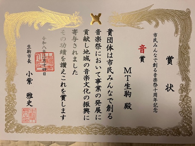 3月14日に生駒市が「市民みんなで創る音楽祭」の10周年記念イベントを行い、その席で表彰されました。